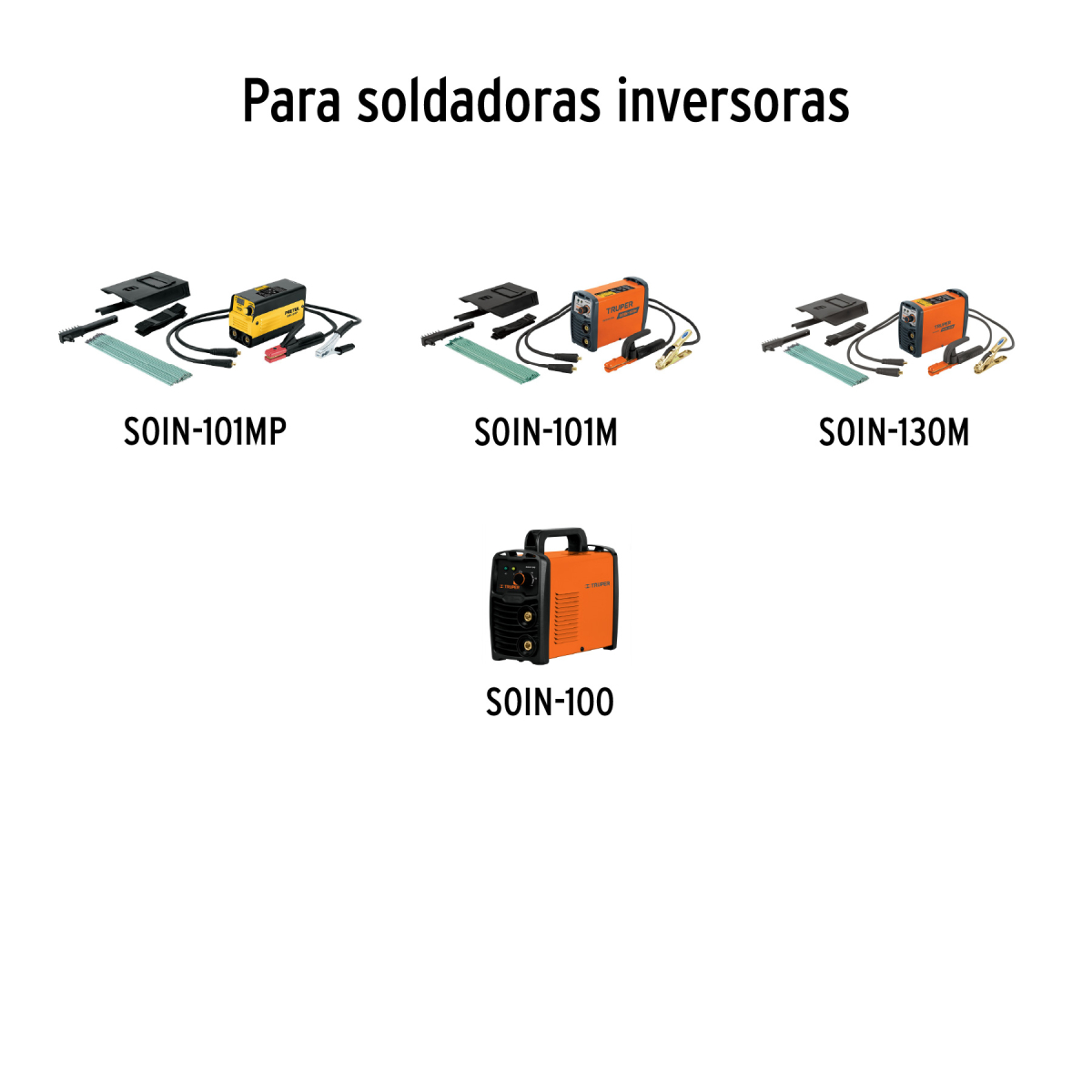 - Para soldadoras inversoras SOIN-101, SOIN-160, SOIN-110/130, SOIN-101M, SOIN-130M, SOIN-130, SOIN-100 marca TRUPER®, SOIN-101P, SOIN-110/130P, SOIN-120/160P, SOIN-101MP, SOIN-100/120MP, SOIN-130P marca PRETUL®