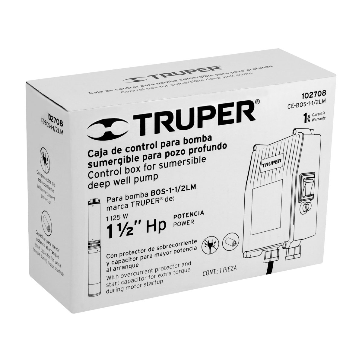 Caja de control para bomba tipo bala 1-1/2 HP Truper compatible con modelo BOS-1-1/2LM, fabricada bajo especificaciones de calidad para protección y regulación en sistemas de bombeo.