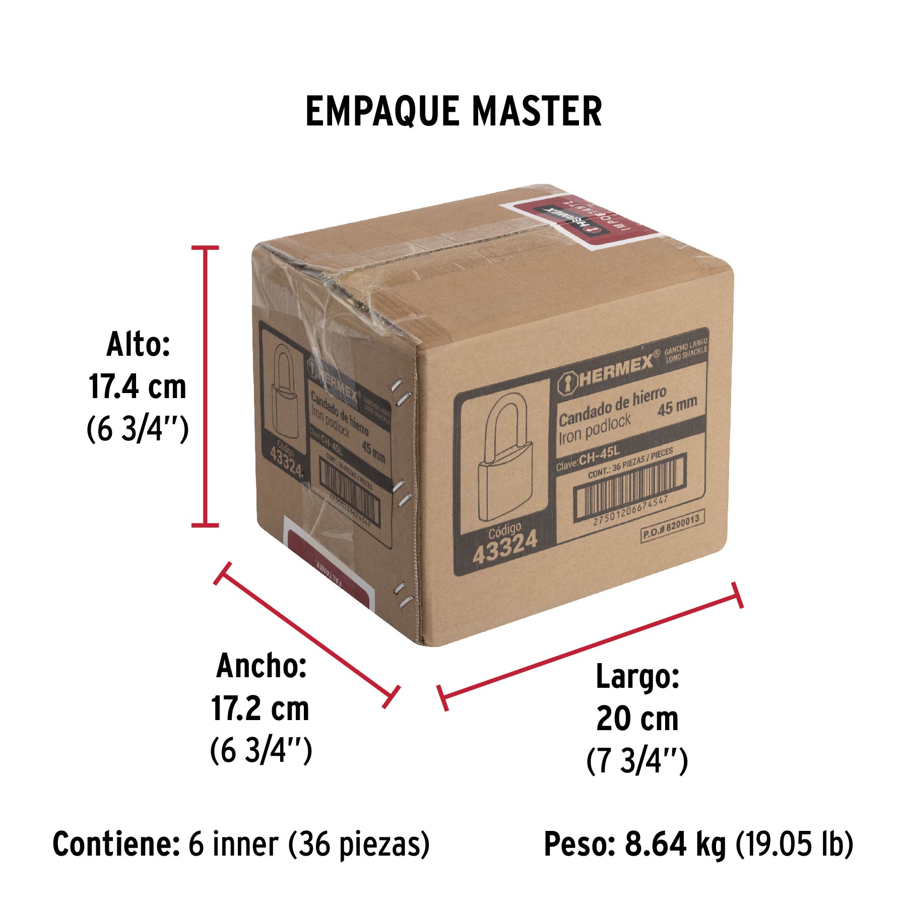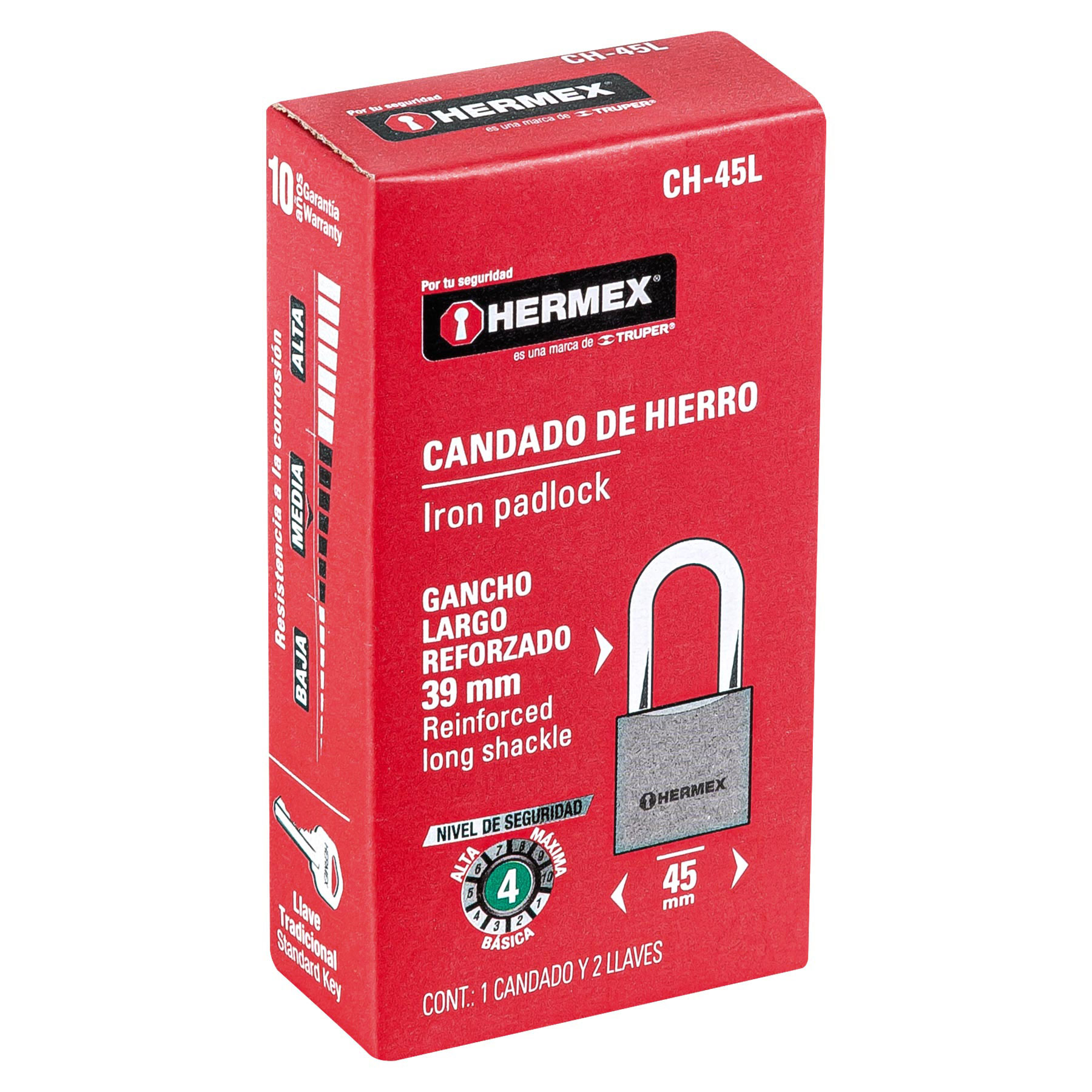 Candado de hierro 45 mm gancho largo en caja, HERMEX