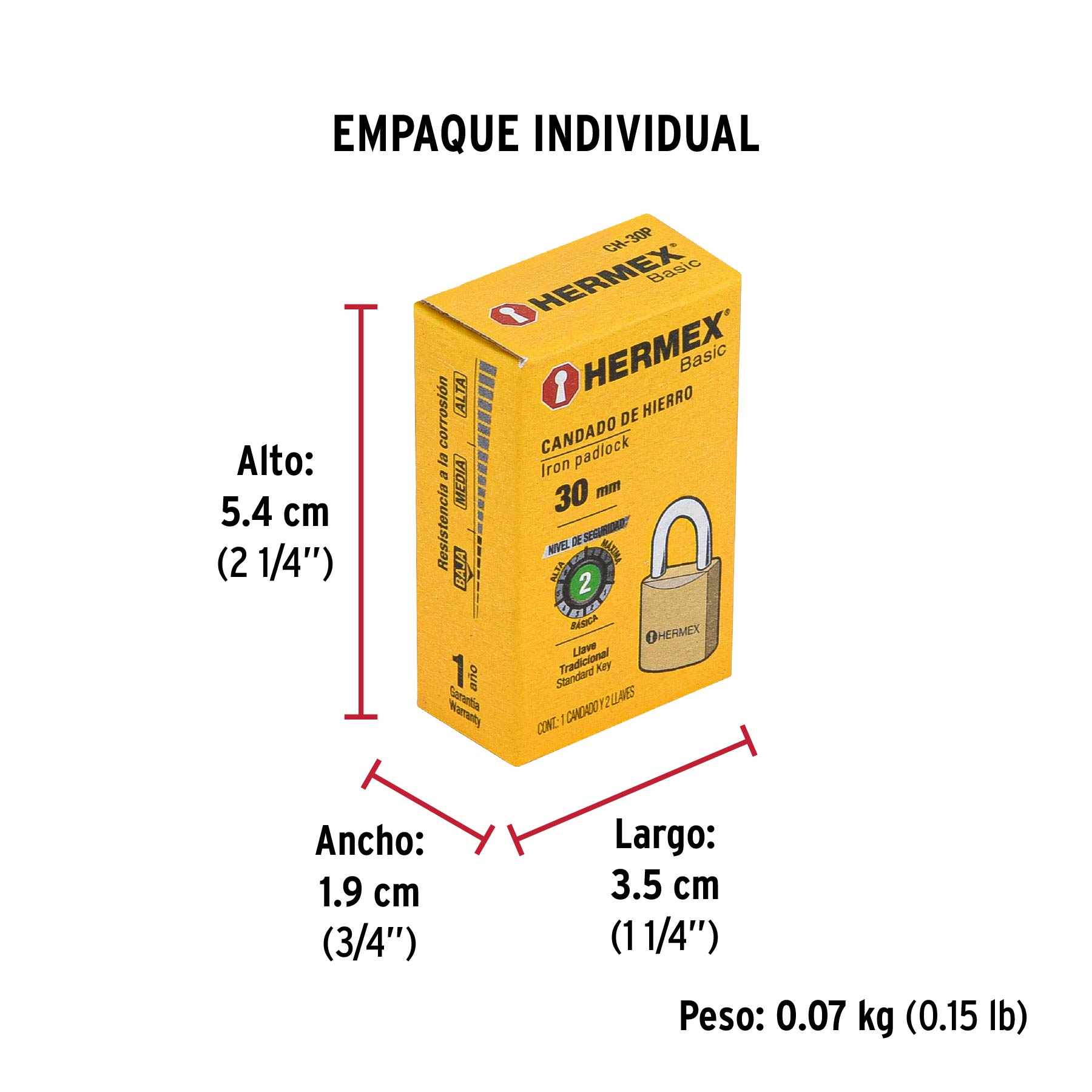 Candado de hierro color latón 30 mm, corto, caja, BASIC