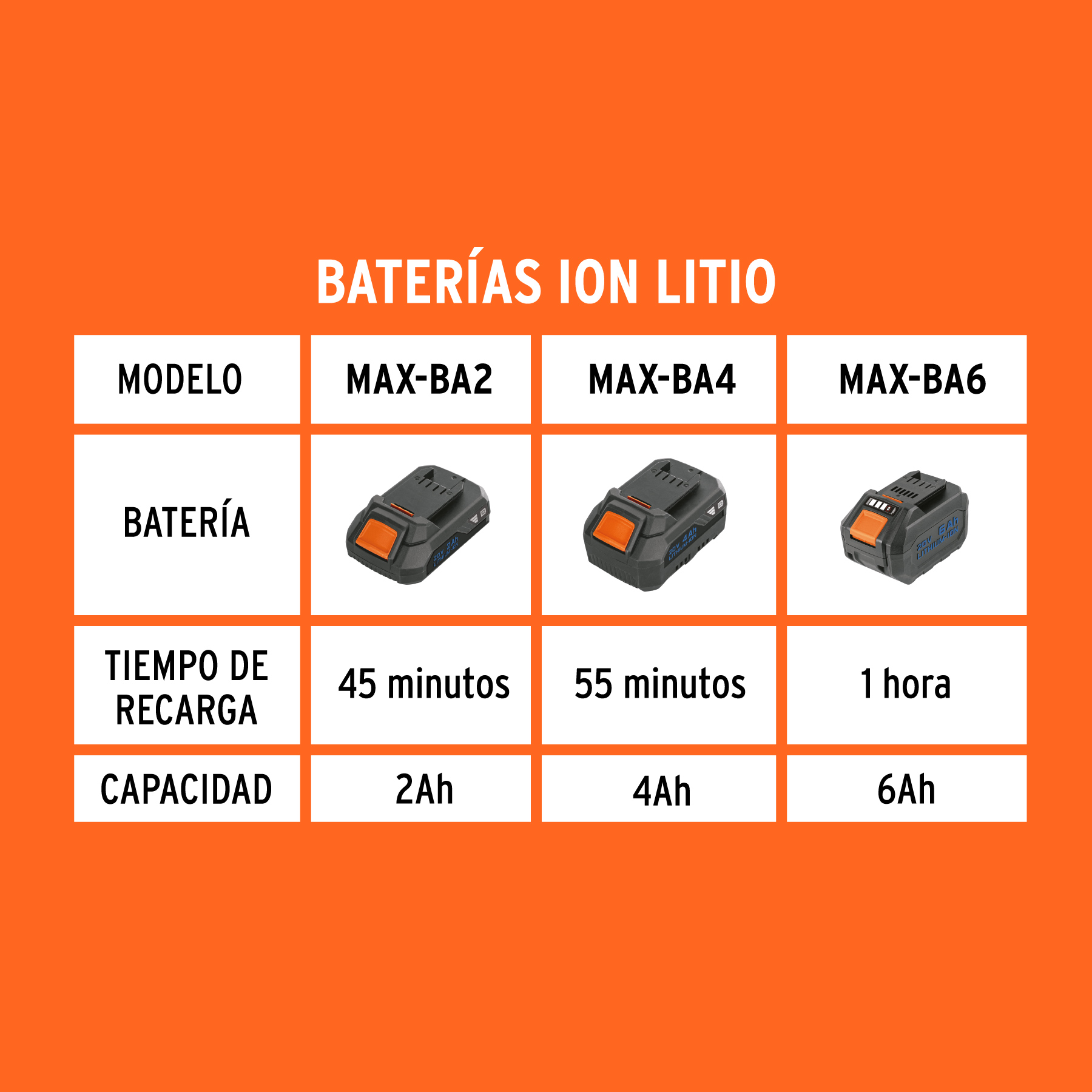 MAX-BA2 (45 minutos), MAX-BA4 (55 minutos) y MAX-BA6 (1 hora)