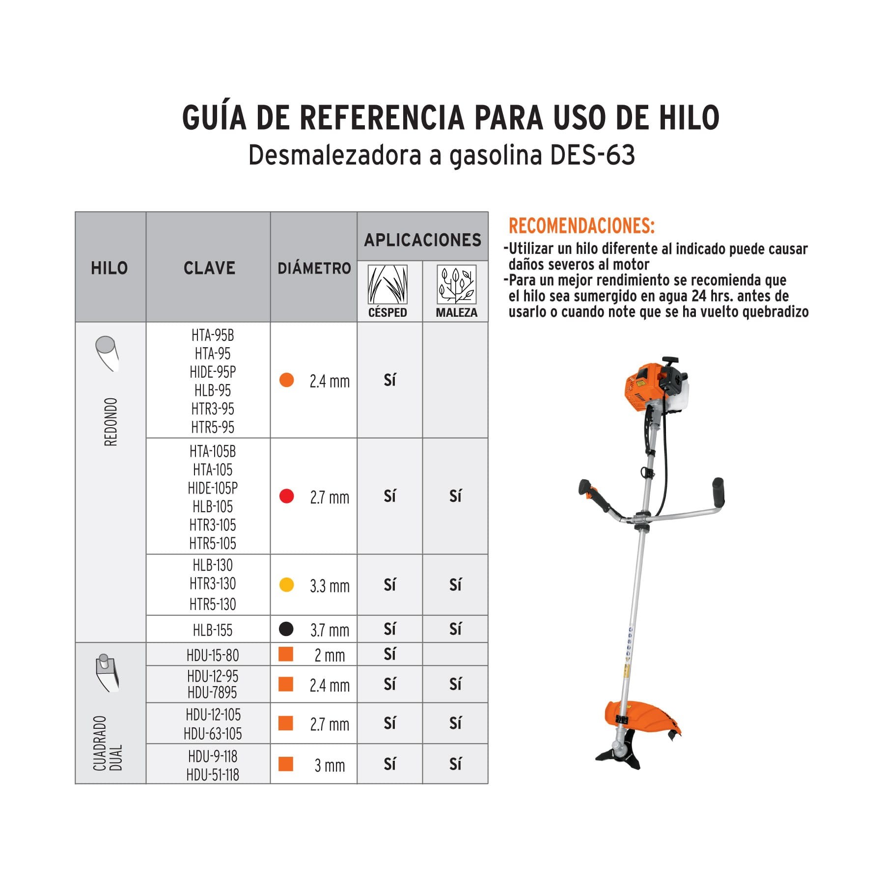 | Diámetro de hilo recomendado | 2.4 – 3.7 mm |