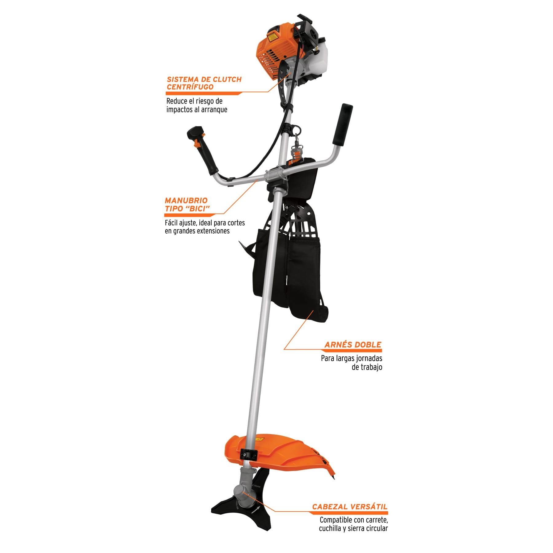 - Arnés robusto y manubrio para uso continuo