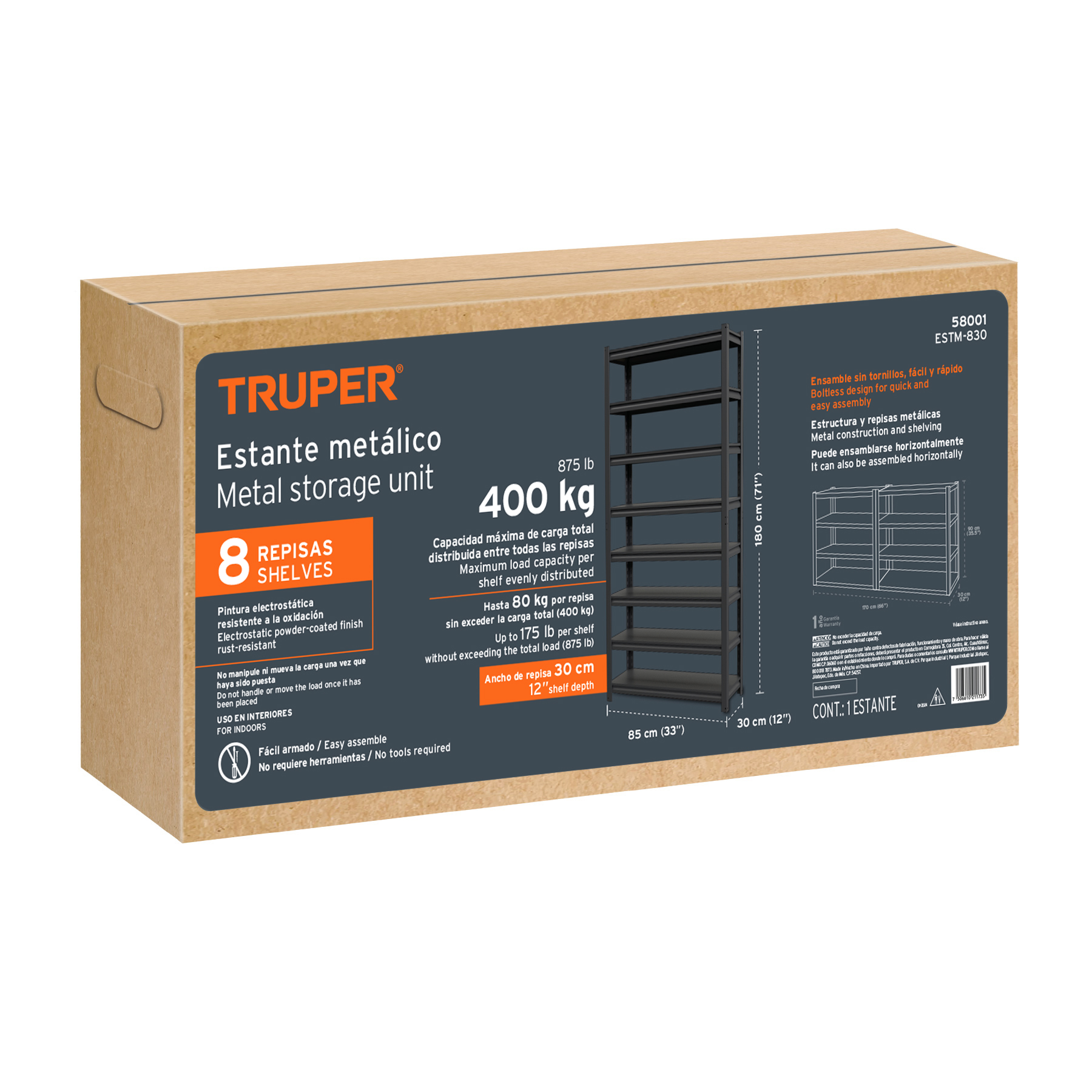 Estante metálico 8 repisas capacidad 80 Kg,180x30x85, TRUPER