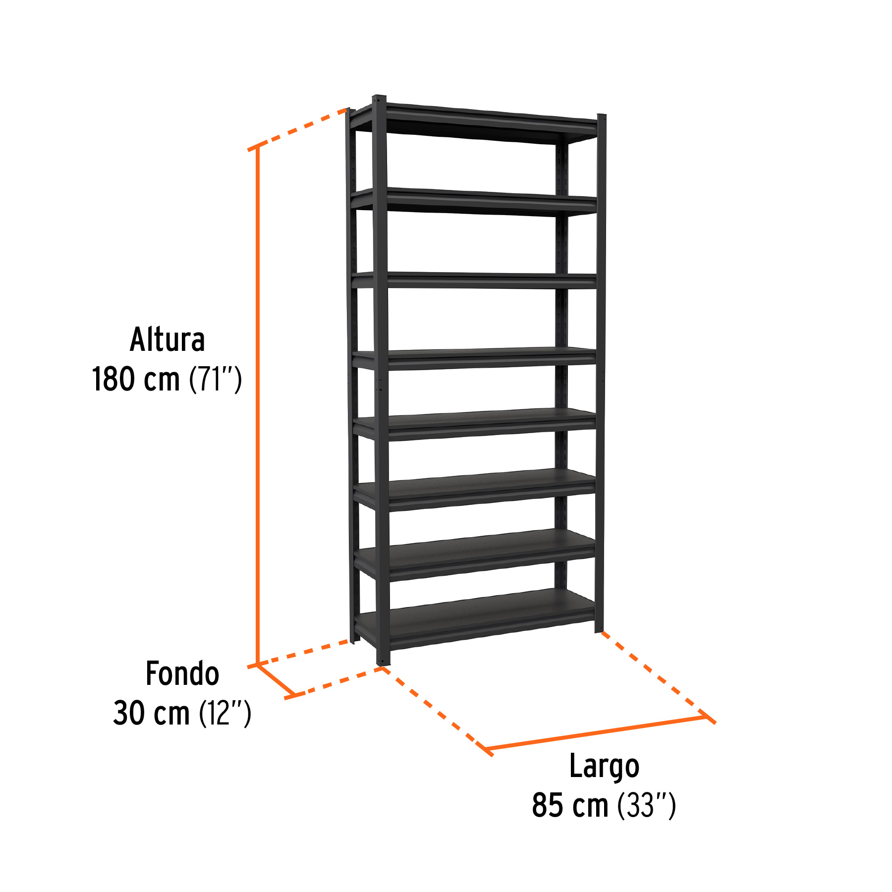 Etiquetas: almacenamiento metálico, estante 180x30x85, estante interior resistente, estante metálico, estante metálico 8 repisas, estante para taller, estantería metálica, estantería para bodega, estantería para garaje, estantería Truper, rack metálico, repisas metálicas