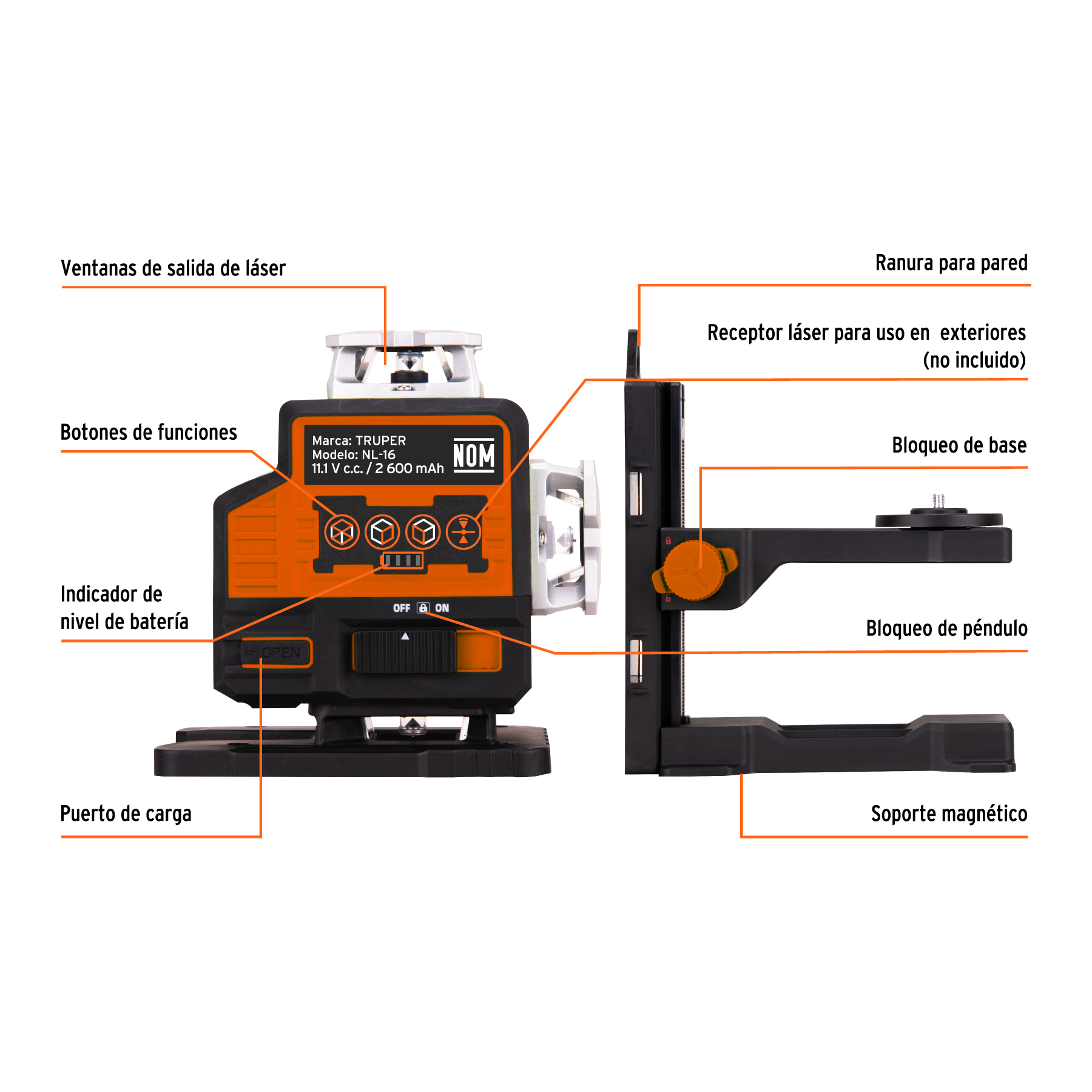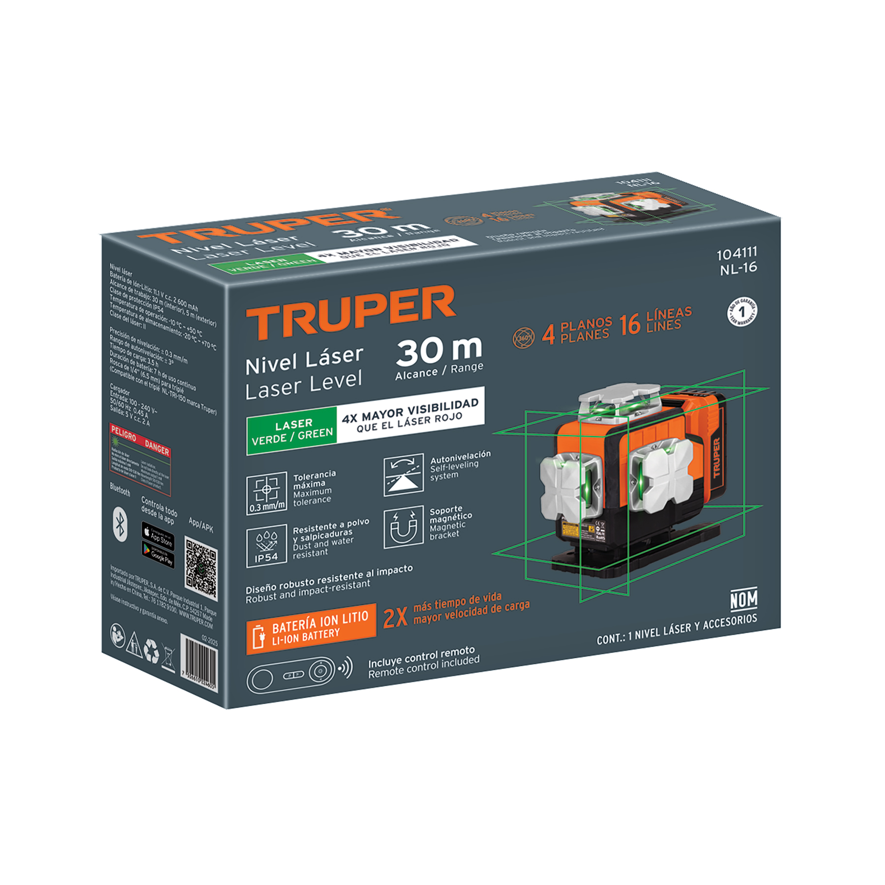 Nivel láser verde, alcance 30m,16 líneas, recargable, TRUPER