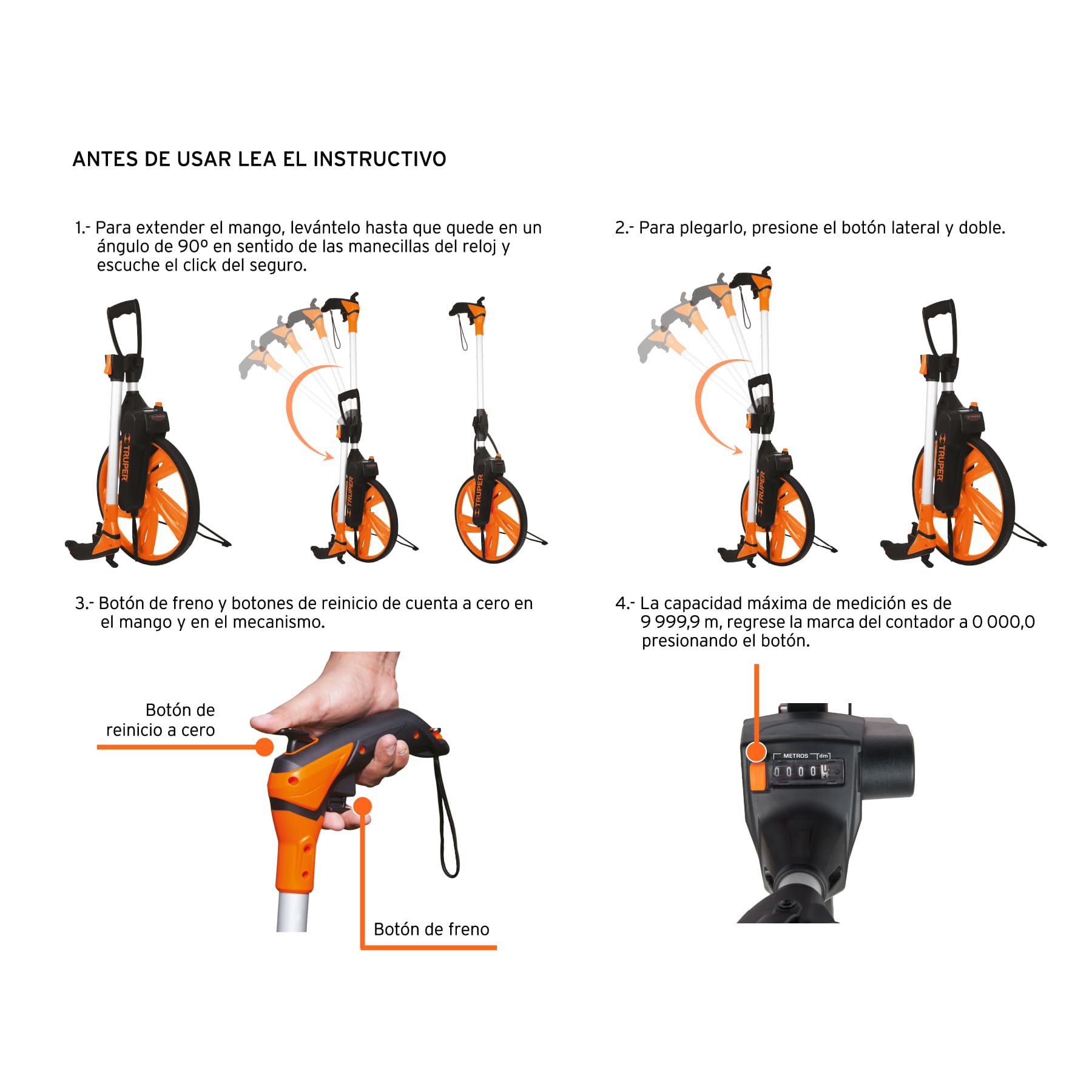 Capacidad máx. de medición 9,999.9 m Altura total 1 m Diámetro de la rueda 13″ (32 cm) Ancho de la rueda 2.7 cm Peso 1.8 kg Empaque individual Caja