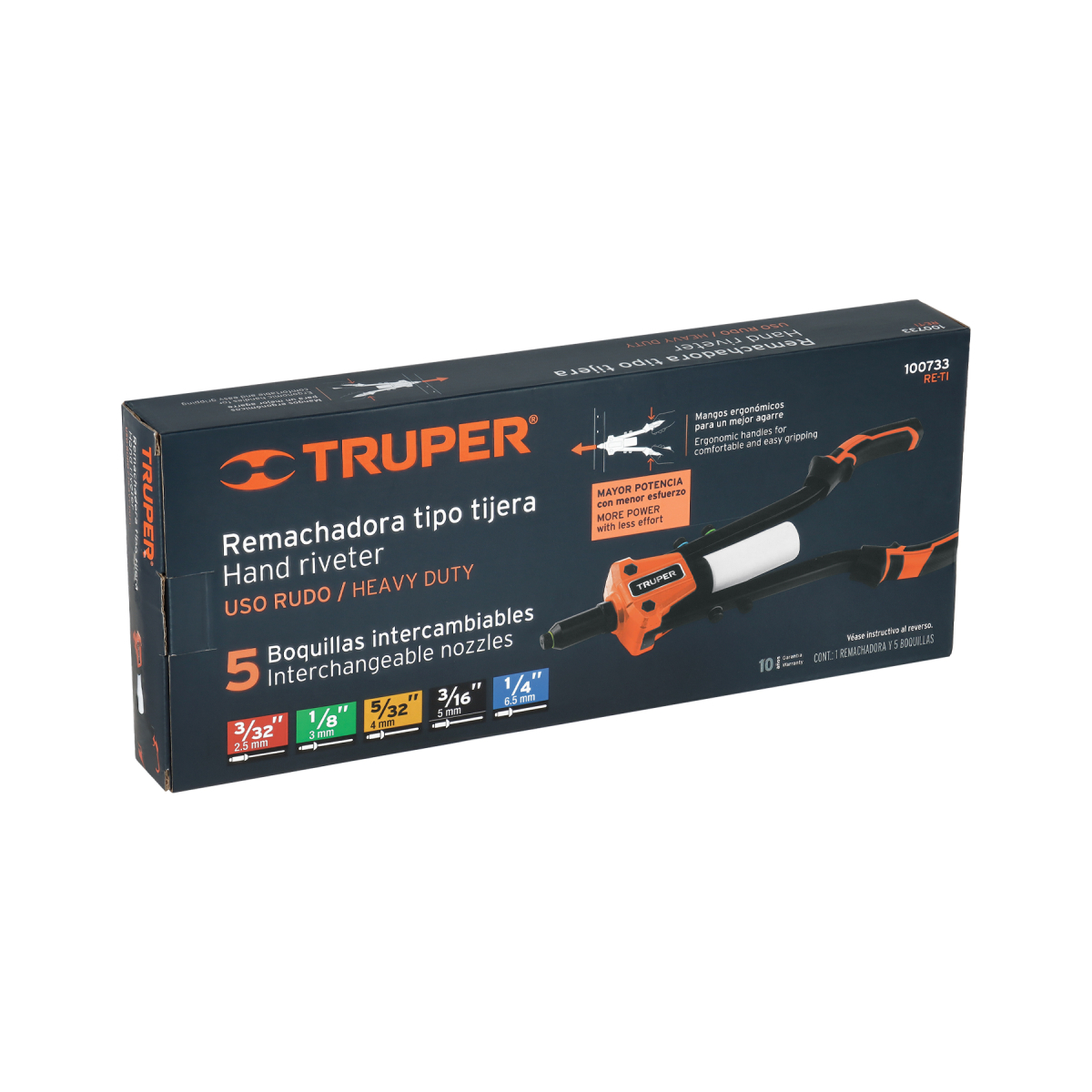 - 5 boquillas intercambiables con indicador de color para fácil identificación de remaches: 3/32″, 1/8″, 5/32″, 3/16″ y 1/4″