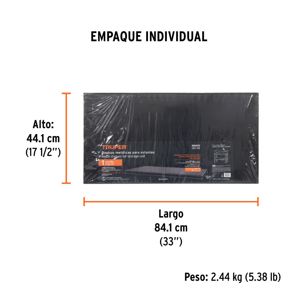Entrepaño metálico 45×85 Truper compatible con estantes EST5-45 y EST8-45, ideal para ampliar y organizar espacios de almacenamiento con diseño resistente y garantía contra defectos de fabricación.