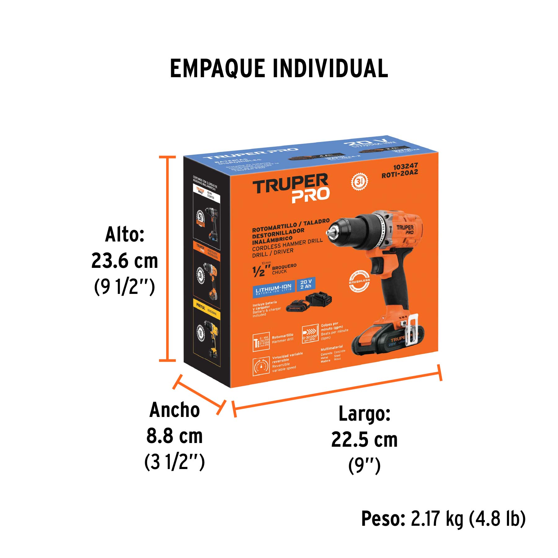 Taladro percutor 1/2″, 20V, 1 batería 2Ah, TRUPER PRO